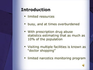 The document outlines a statewide initiative aimed at screening patients seeking narcotics in urgent care facilities to reduce prescription drug abuse. It describes a multi-phase project involving data gathering, software interface design, workflow evaluation, and analysis to identify potential narcotic abusers. The goal is to improve patient care, optimize healthcare resources, and support providers by allowing access to a state narcotics monitoring program.