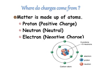 This document discusses an experiment where a plastic ruler is rubbed and then attracts paper scraps. The ruler carries an electric charge after being rubbed, exerting an electric force on the paper. Atoms are made up of protons with a positive charge, neutrons with a neutral charge, and electrons with a negative charge, which can explain where electric charges come from.