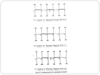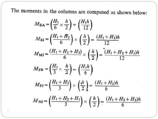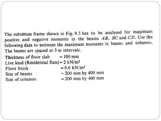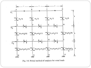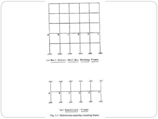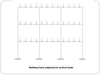 This document discusses structural analysis and the analysis of building frames. It begins by outlining the four stages of structural engineering projects: planning, analysis, design, and construction. It then discusses the objectives of structural design, which are safety, economy, utility, and aesthetics. The purpose of structural analysis is to determine reactions, internal forces, and deformations caused by applied loads. Common structural forms include tension/compression structures, flexural beams/frames, and surface structures. Key structural properties like strength, stiffness, and modeling/idealization are also covered. Finally, methods for analyzing building frames like approximate, cantilever, and portal methods are presented.