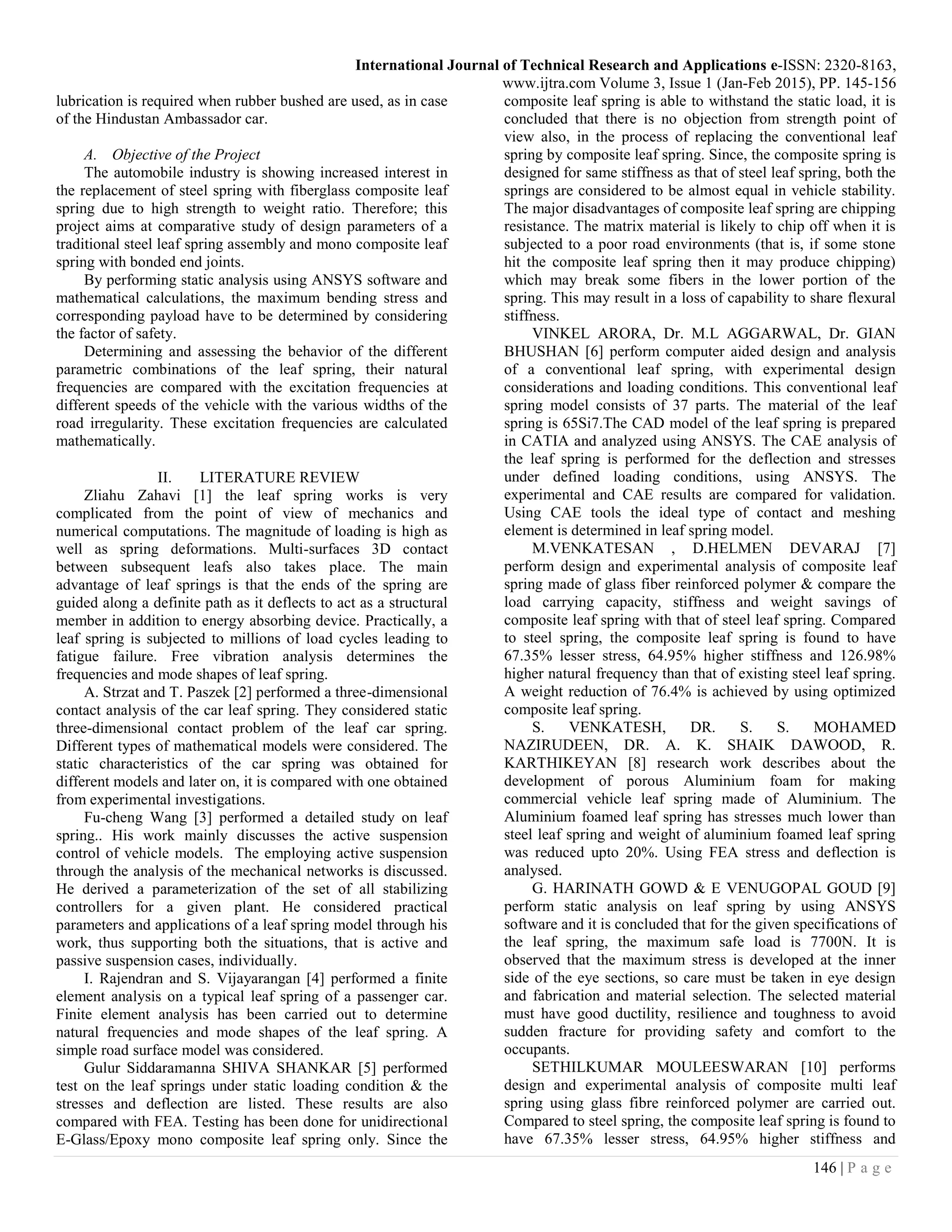 This document presents a study on the static and modal analysis of leaf springs used in military jeeps through finite element analysis (FEA). It aims to compare traditional steel leaf springs with fiberglass composite leaf springs in terms of performance, weight reduction, and stress under loading conditions. The findings suggest that composite springs can significantly reduce weight while maintaining similar stiffness and performance compared to steel, though potential issues like chipping resistance are noted.