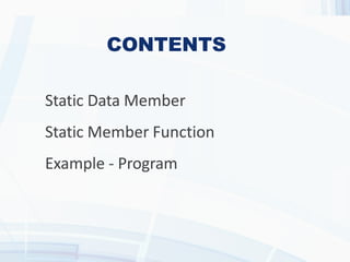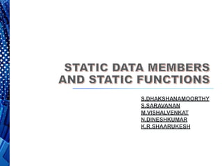 The document provides an overview of static data members and static member functions in C++. It explains their characteristics, initialization process, and provides code examples demonstrating their usage. Key points include shared access among class objects and how static functions can only access other static members.