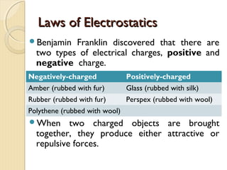 2. There are two types of electrical charges: positive and negative. Charge is measured in coulombs. Unlike charges attract and like charges repel according to Coulomb's law.