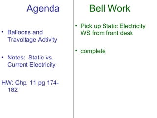 The document discusses static electricity and current electricity. It provides an agenda for a lesson that includes discussing the difference between static and current electricity. It defines static electricity as the imbalance and buildup of electric charges on objects at rest, whereas current electricity involves the flow of electric charges. It describes how rubbing objects can cause the transfer of electrons and creation of static charges.