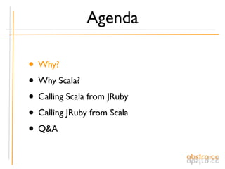 The document discusses integrating JRuby and Scala, highlighting the benefits of using both static and dynamic typing to leverage the strengths of each language. It covers various integration techniques, performance considerations, and Scala's unique features like functional programming and type inference. The presentation concludes with a focus on Scuby, a DSL that simplifies calling JRuby from Scala, along with future development goals.