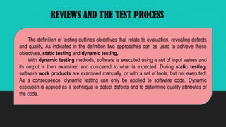 This document discusses static and dynamic testing techniques. It defines static testing as examining software work products manually or with tools without executing them, while dynamic testing executes software using input values to examine outputs. The document then describes the phases of a formal review process and defines roles in a review. It identifies the moderator, author, scribe, reviewers, and manager. Finally, it explains the differences between inspections, technical reviews, and walkthroughs, providing details on each type of review.