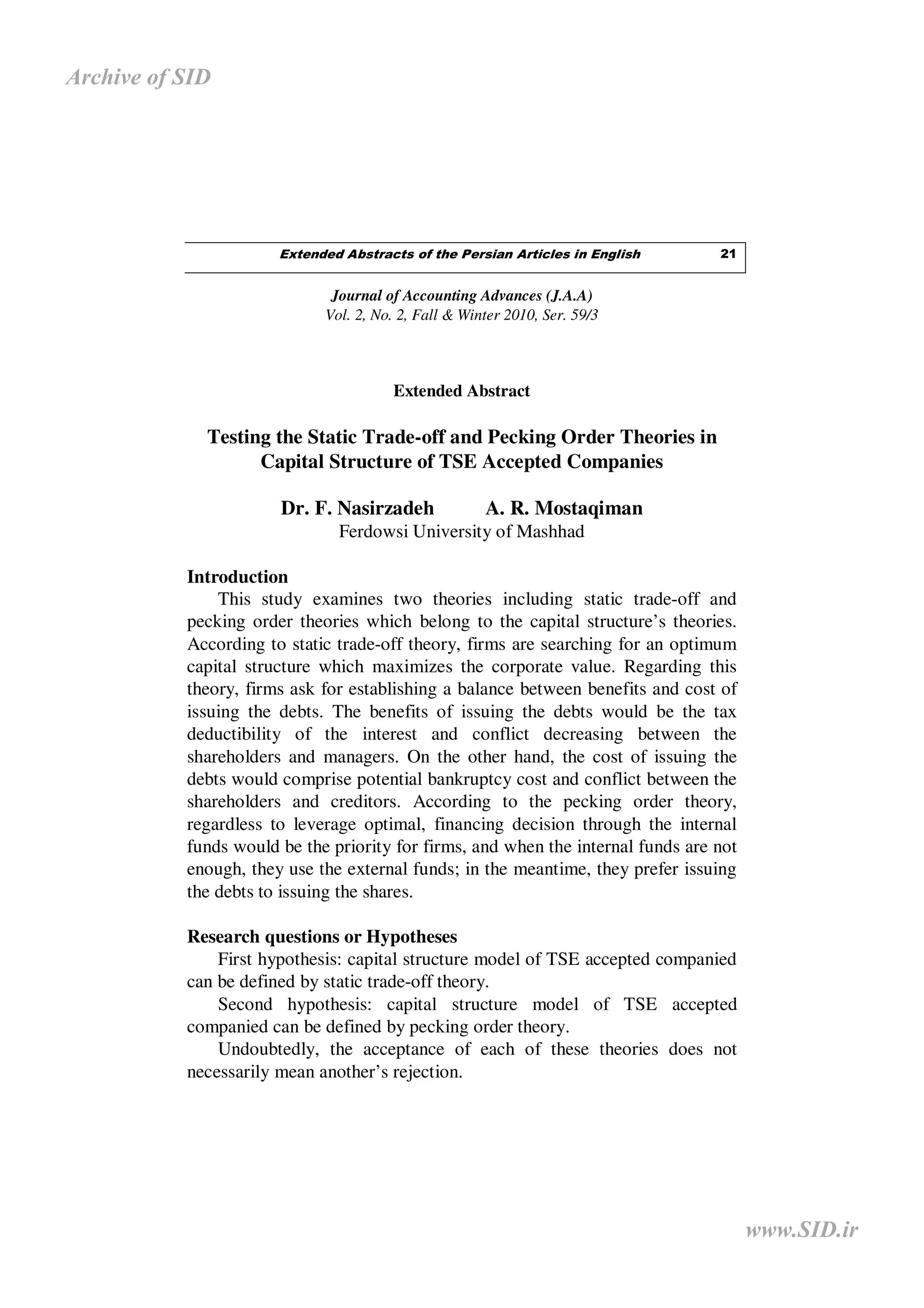 This study examines the static trade-off theory and pecking order theory of capital structure using data from 279 companies on the Tehran Stock Exchange over 5 years. The static trade-off theory posits that firms seek an optimal capital structure that balances the costs and benefits of debt, while the pecking order theory states that firms prioritize internal financing and use debt over equity when external funds are needed. The results show that neither theory fully explains the capital structures. However, evidence is found for the static trade-off theory when analyzed by industry, supporting the importance of industry in financing decisions per the pecking order theory. The conclusions differ from some prior studies but are consistent with others that found more support for the static
