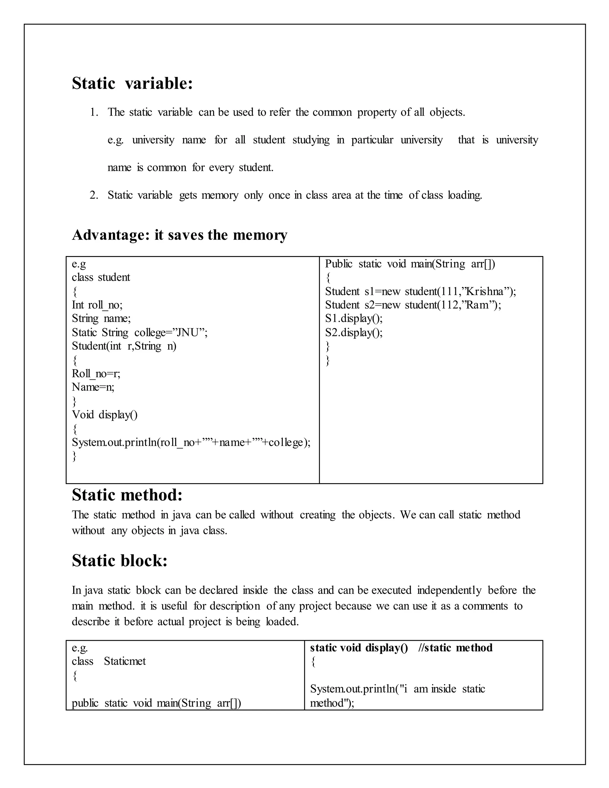 1. Static variables are used to refer to common properties of all objects of a class and only one copy is created in memory. Static methods can be called without creating an object.