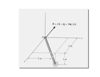 The document discusses using the dot product to determine the angle between two vectors and to determine the projection of a vector along a specified line. It provides definitions and examples of using the dot product to calculate the angle between two vectors and to find the parallel and perpendicular components of a vector. An example problem demonstrates applying these concepts to find the angle between a force vector and a pole and the magnitude of the force projection along the pole.