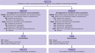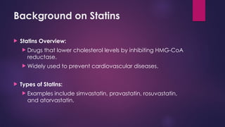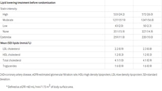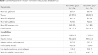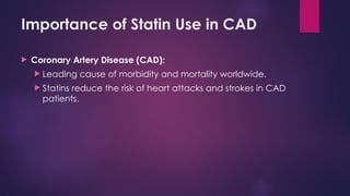 The document provides an overview of statins, their efficacy in treating coronary artery disease, and a three-year randomized trial comparing rosuvastatin and atorvastatin. It highlights no significant difference in primary outcomes between the two drugs but notes a higher incidence of new onset diabetes and cataract surgery in the rosuvastatin group. The study emphasizes the importance of monitoring side effects and tailoring statin choice to patient profiles.