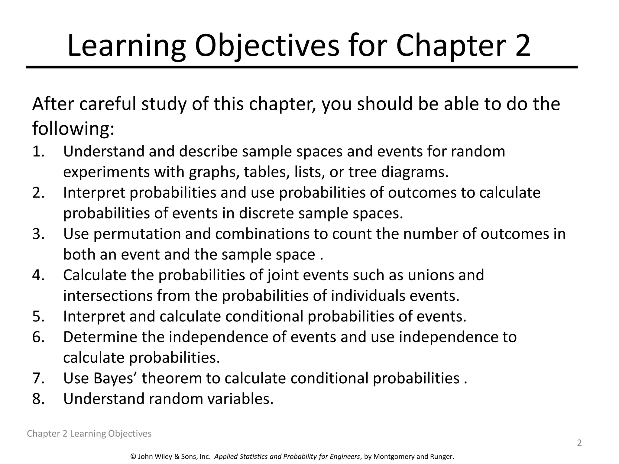 Chapter 2 focuses on probability concepts, including sample spaces, events, and probability rules. Key learning objectives encompass understanding random experiments, calculating probabilities of joint and conditional events, and applying counting techniques. The chapter emphasizes the application of models to analyze physical systems and the importance of recognizing randomness in various scenarios.