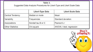 This document provides an overview of statistical analysis of questionnaire data. It discusses topics like questionnaire construction, data entry, reliability analysis using Cronbach's alpha, descriptive statistics for Likert scale items including frequencies, medians, interquartile ranges and box plots. It also covers composite scale analysis using means, standard deviations and comparisons between groups. An example is provided on assessing student satisfaction regarding teaching using 4 questionnaire items from 60 students. Results would be reported using tables and figures with interpretations.