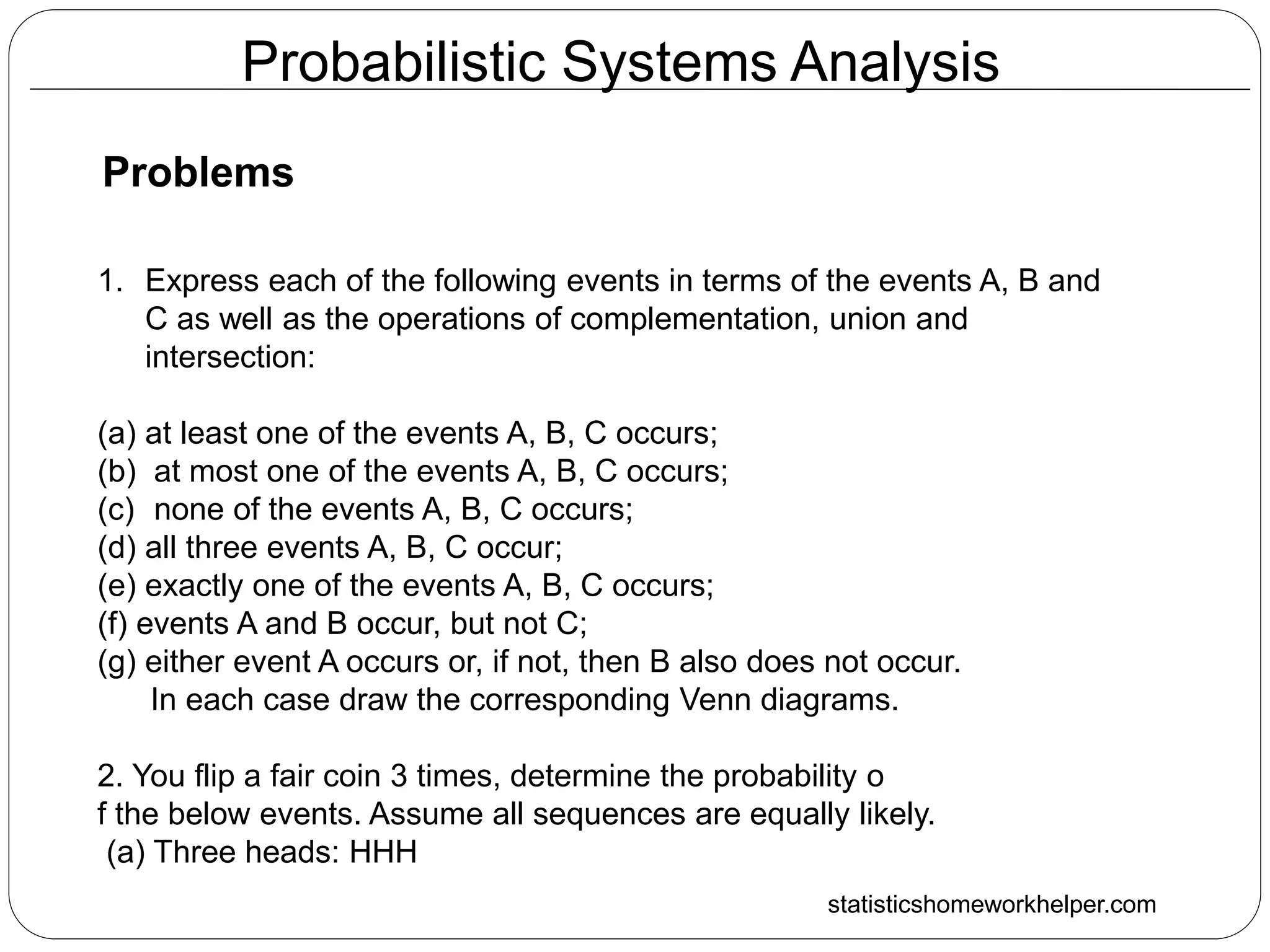 The document provides a comprehensive overview of statistics problems related to probabilities, event expressions, and applications using scenarios such as coin flips, dice rolls, and dart games. It includes methods for calculating probabilities, Venn diagrams, and proofs related to probability theory. Additionally, the document encourages the use of uniform probability laws and discusses specific probability outcomes for different games and events.