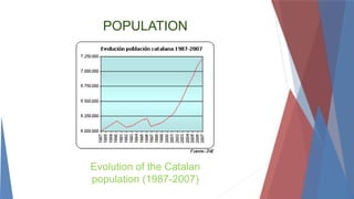 This document contains statistical data on population growth in Catalonia from 1987 to 2007, a description of Catalonia's climate as cold in winter and hot in summer, information on birth and death rates from the 18th century to 21st century with a note on differences between interurban and urban death zones, and information on minimal wages in Europe.