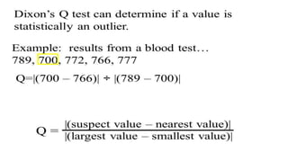 The document discusses the application of statistical methods in pharmaceutical analysis, covering topics like normal distribution, confidence intervals, t-tests, ANOVA, regression analysis, and the correlation coefficient. It highlights the importance of these methods in evaluating drug efficacy, comparing different treatments, and analyzing data in the pharmaceutical industry. Additionally, it provides insights into specific tests for analyzing data sets, including the rejection of outliers using the q-test.