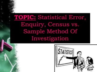 This document discusses statistical error, statistical enquiry, and the differences between census and sample methods of investigation. It defines statistical error as inaccuracies that arise from imperfect measurement or observation in statistics. There are two types of statistical error: sampling errors, which occur when making inferences about a population based on a sample, and non-sampling errors, which are introduced during data collection and processing. The document also explains that a statistical enquiry is a search for facts to study a problem, while a census collects data from the entire population and sampling collects from a representative subset.