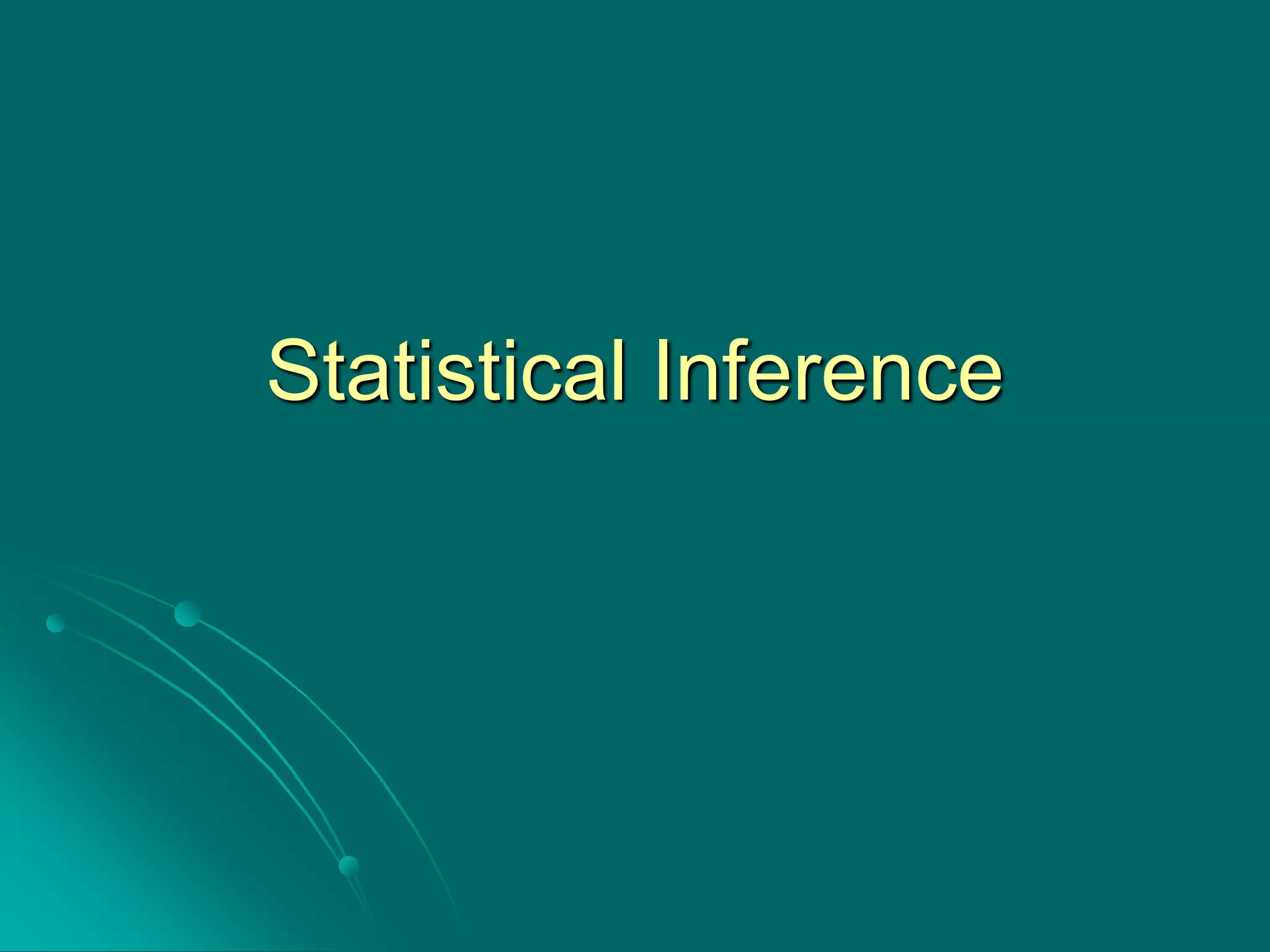 Statistical inference involves drawing conclusions about a population based on a sample. It has two main areas: estimation and hypothesis testing. Estimation uses sample data to obtain point or interval estimates of unknown population parameters. Hypothesis testing determines whether to accept or reject statements about population parameters. Confidence intervals give a range of values that are likely to contain the true population parameter, with a specified level of confidence such as 90% or 95%.