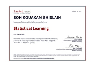 Soh Kouakam Ghislain has completed Stanford University's free online course in statistical learning with distinction, scoring 90 or more on the quizzes. The statement clarifies that this achievement does not mean affiliation with Stanford or confer any academic credits or degrees. Verification of authenticity is available at a provided URL.