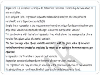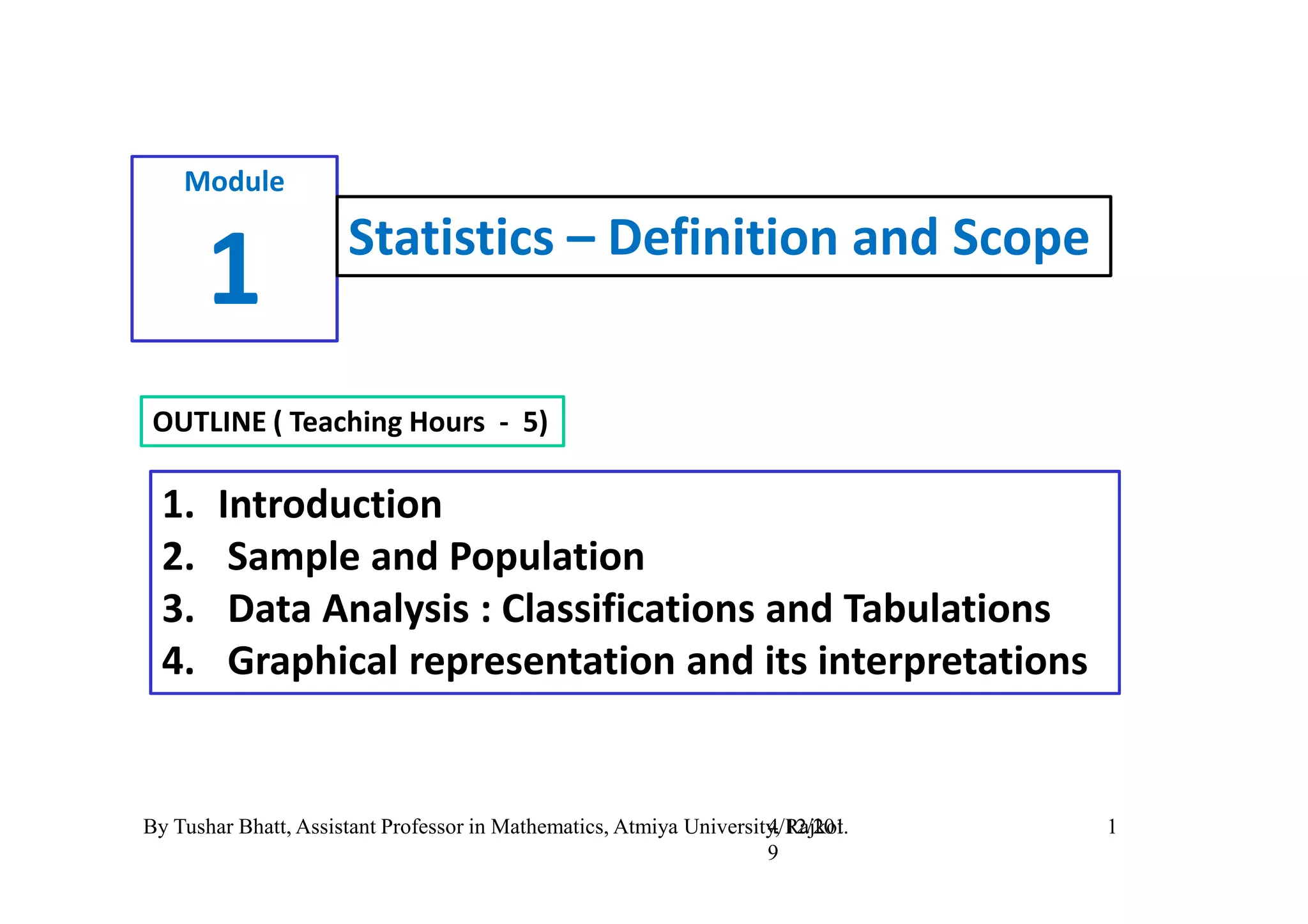 The document outlines a statistics module covering definitions, classifications of data (qualitative, quantitative, temporal, geographical), and data analysis techniques including tabulation and graphical representation methods such as pictograms, bar charts, and pie charts. Examples illustrate how to compile and represent data effectively, analyze trends over time, and construct various types of graphs for both ungrouped and grouped data. Additionally, it touches on measures of central tendency, specifically mean, median, and mode.