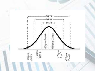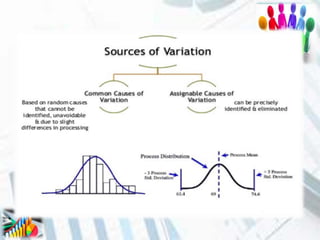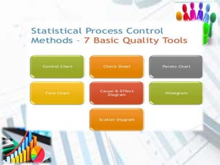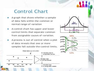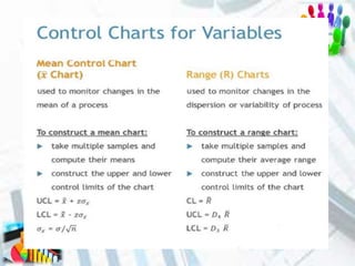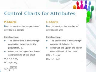 The document discusses quality control and statistical quality control. It defines quality as properties valued by consumers and quality control as maintaining standards through testing samples. The goal of quality control is to eliminate nonconformities and wasted resources at lowest cost. Statistical quality control uses statistical tools like descriptive statistics, acceptance sampling, and statistical process control to measure and control variation in processes. Examples are provided of x-bar and R charts to determine if a gluing process is in control, as well as P and C charts to monitor defects and complaints.