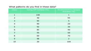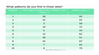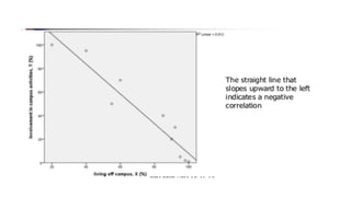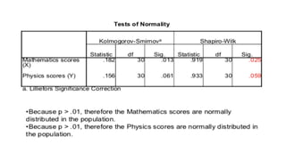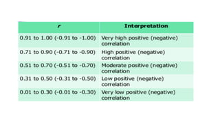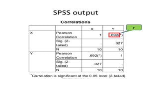 Dokumen ini membahas tentang hubungan korelasi dalam pendidikan, khususnya antara skor matematika dan fisika siswa, serta metode untuk menghitung dan menganalisis korelasi menggunakan koefisien korelasi Pearson. Terdapat penjelasan tentang jenis-jenis korelasi: positif, negatif, dan nol, serta langkah-langkah pengujian hipotesis untuk menentukan signifikansi korelasi dengan menggunakan SPSS. Contoh kasus diberikan untuk menunjukkan penerapan konsep tersebut dalam penelitian nyata.