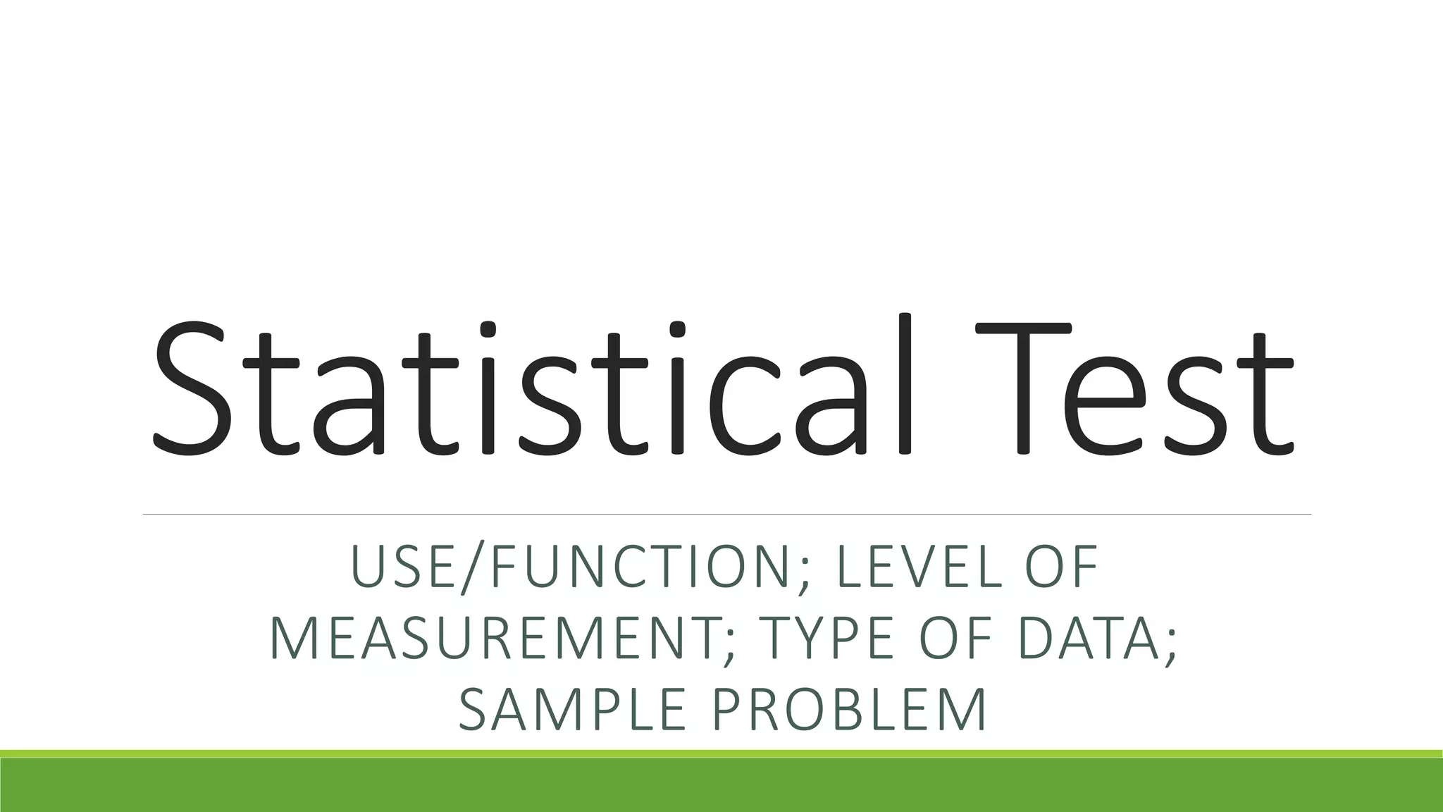 This document describes 11 statistical tests, including their use/function, level of measurement, type of data, and sample problems. The tests covered are: Pearson R, Spearman Rank Order, One Population Z-Test, Z-Test of Independent Proportions, Z-test of Dependent Proportions, T-Test of Independent Means, T-Test of Dependent Means, Chi-Square Test of Goodness of Fit, Chi-Square Test of Independent Proportions, One-Way Analysis of Variance (ANOVA I), and Two-Way Analysis of Variance (ANOVA II). Each test is used to analyze different types of data and answer different statistical questions.