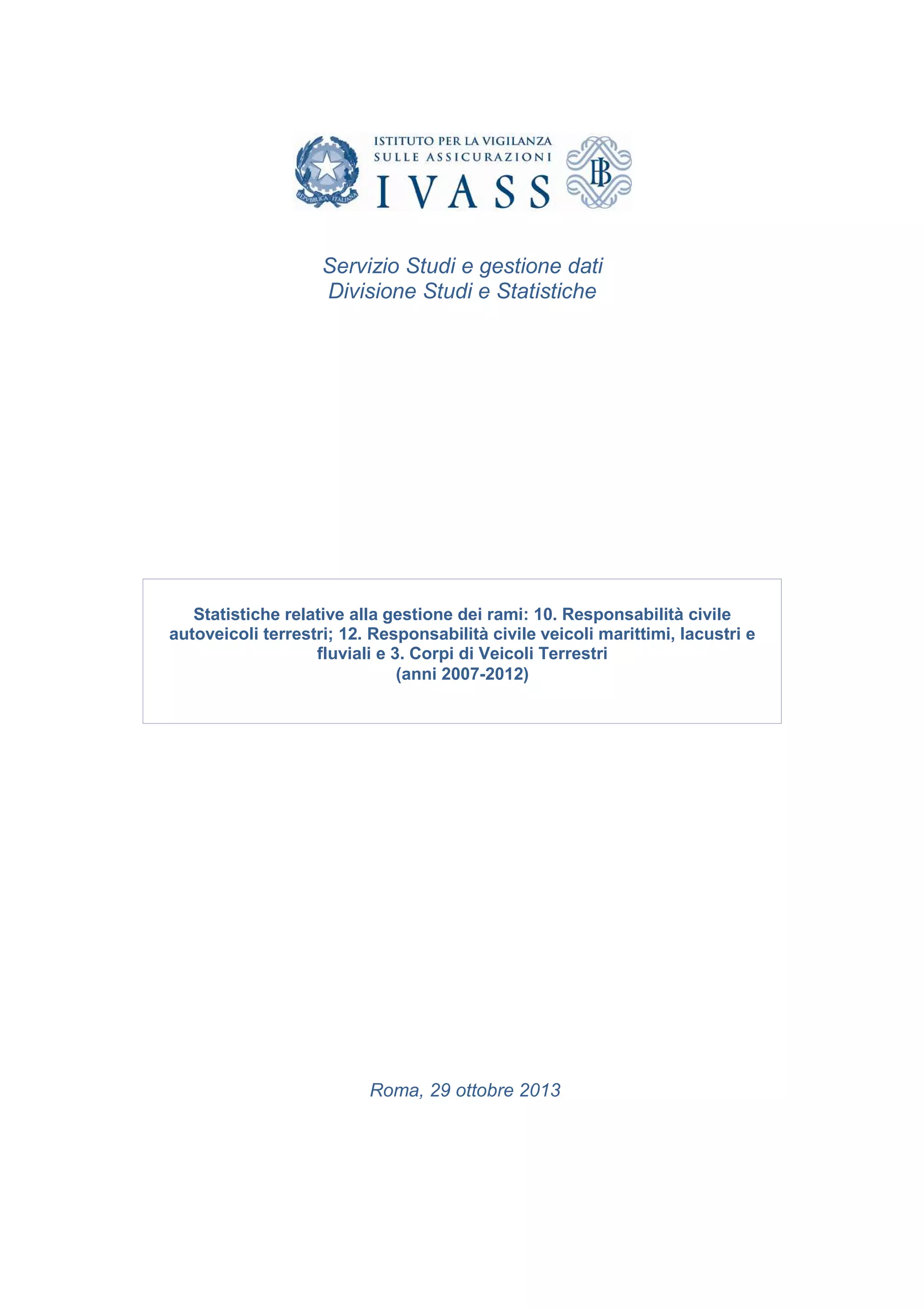 Il documento fornisce un'analisi statistica riguardante la gestione dei rami di responsabilità civile per autoveicoli terrestri e veicoli marittimi, evidenziando un volume di premi nel 2012 di 20.225 milioni di euro. Si osserva una diminuzione continua dei sinistri denunciati e una sostanziale stabilità nei costi di gestione, mentre il risultato del conto tecnico segnala un ritorno all'utile dopo anni di perdite. Infine, si sottolinea l'importanza di considerare la variazione dei dati nel contesto di cambiamenti nelle aziende del settore a partire dal 2010.