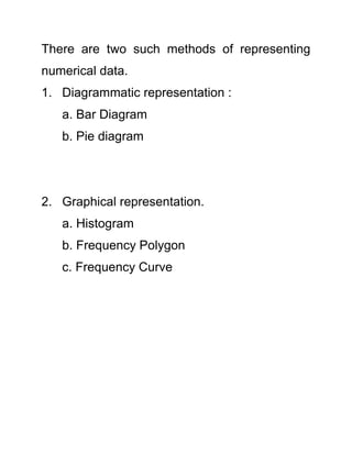 This document discusses how to represent statistical data using pie diagrams. It provides instructions on how to construct a pie diagram, including calculating the central angle for each component and drawing the pie chart. Examples are given showing how to represent data on student transportation, crop area, and investment types in pie diagrams. Pie diagrams divide a circle into sectors proportional to each data component as a visual representation of the data.