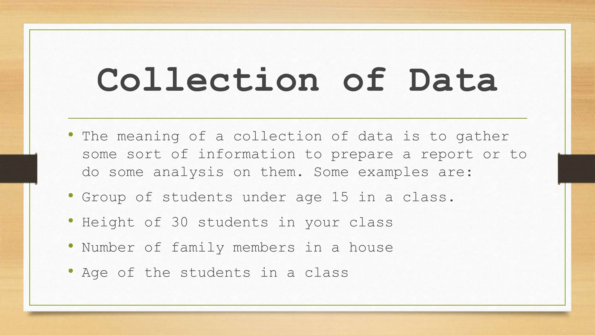 This document discusses how to collect, present, and analyze statistical data. It provides examples of collecting data on student characteristics like age and exam scores. Data can be presented through tables that group values into frequency distributions to calculate quantities like the number of students scoring above a threshold. Graphs like bar graphs, histograms, and frequency polygons can also represent grouped data visually. Measures of central tendency - mean, median, and mode - are introduced to summarize typical values in a data set. Formulas and examples are given for calculating each of these statistical measures.