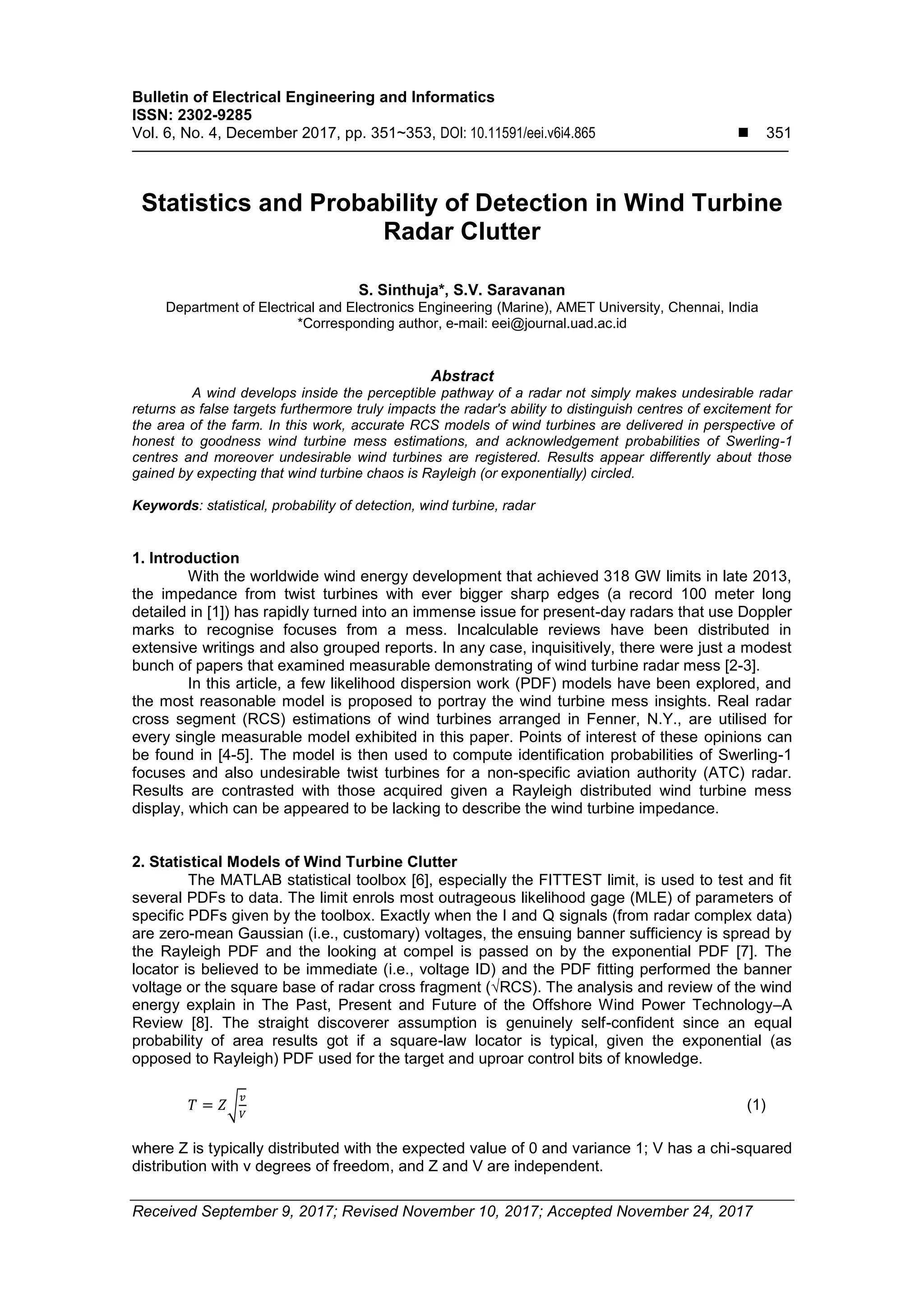 This document discusses the challenges posed by wind turbine radar clutter, particularly how it affects radar's ability to detect targets. Accurate radar cross section models based on real measurements are developed, and probabilities of detection using various statistical models are analyzed, with findings suggesting that traditional Rayleigh distribution models are insufficient. The study highlights the spatial extent of wind turbine interference and demonstrates that the t-location scale probability density function fits observed data more accurately than other models.