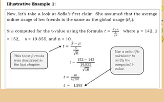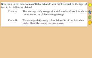 Sofia conducted a survey of her friends' daily social media usage to see if it differed from the global average of 142 minutes reported in another survey. She formulated two claims: Claim A stated her friends' usage was the same as the global average, while Claim B stated it was higher. Hypothesis testing would be needed to statistically analyze the data from Sofia's survey to determine if her friends' usage supported Claim A or Claim B. Hypothesis testing involves defining a null hypothesis (Ho) stating no difference and an alternative hypothesis (Ha) stating a difference.