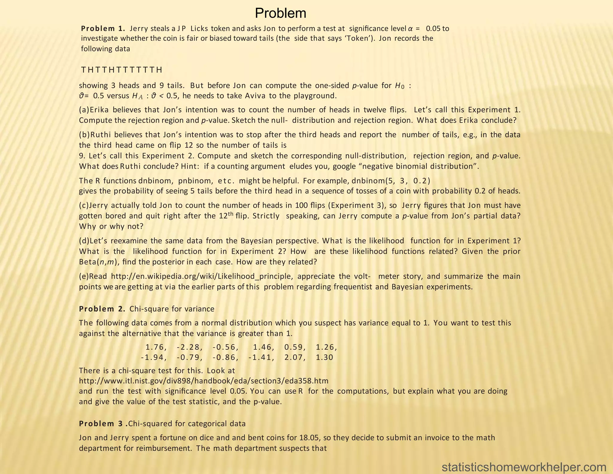 - It then provides an example of a multi-part statistics problem involving hypothesis testing on coin flips and dice data. It asks the reader to conduct various statistical tests and interpret the results.