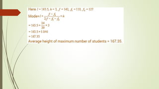 This document contains a summary of key statistical concepts and methods for analyzing grouped data. It includes 10 topics: (1) names of group members, (2) acknowledgements, (3) an introduction to statistics, (4) grouped data, (5) mean of grouped data, (6) mode of grouped data, (7) median of grouped data, (8) graphical representation of cumulative distribution, (9) conclusion, and (10) bibliography. The document provides examples and explanations of statistical techniques for summarizing and visualizing grouped data, including calculating the mean, mode, and median from frequency tables and constructing cumulative frequency distributions in ogive graphs.