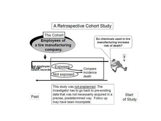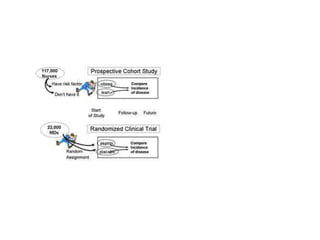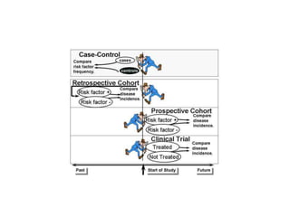 3) It outlines different types of study designs including descriptive (PO) versus analytic (PICO/PECO) studies, and experimental versus observational studies. Within observational studies, it distinguishes between cohort, case-control, and cross-sectional designs.