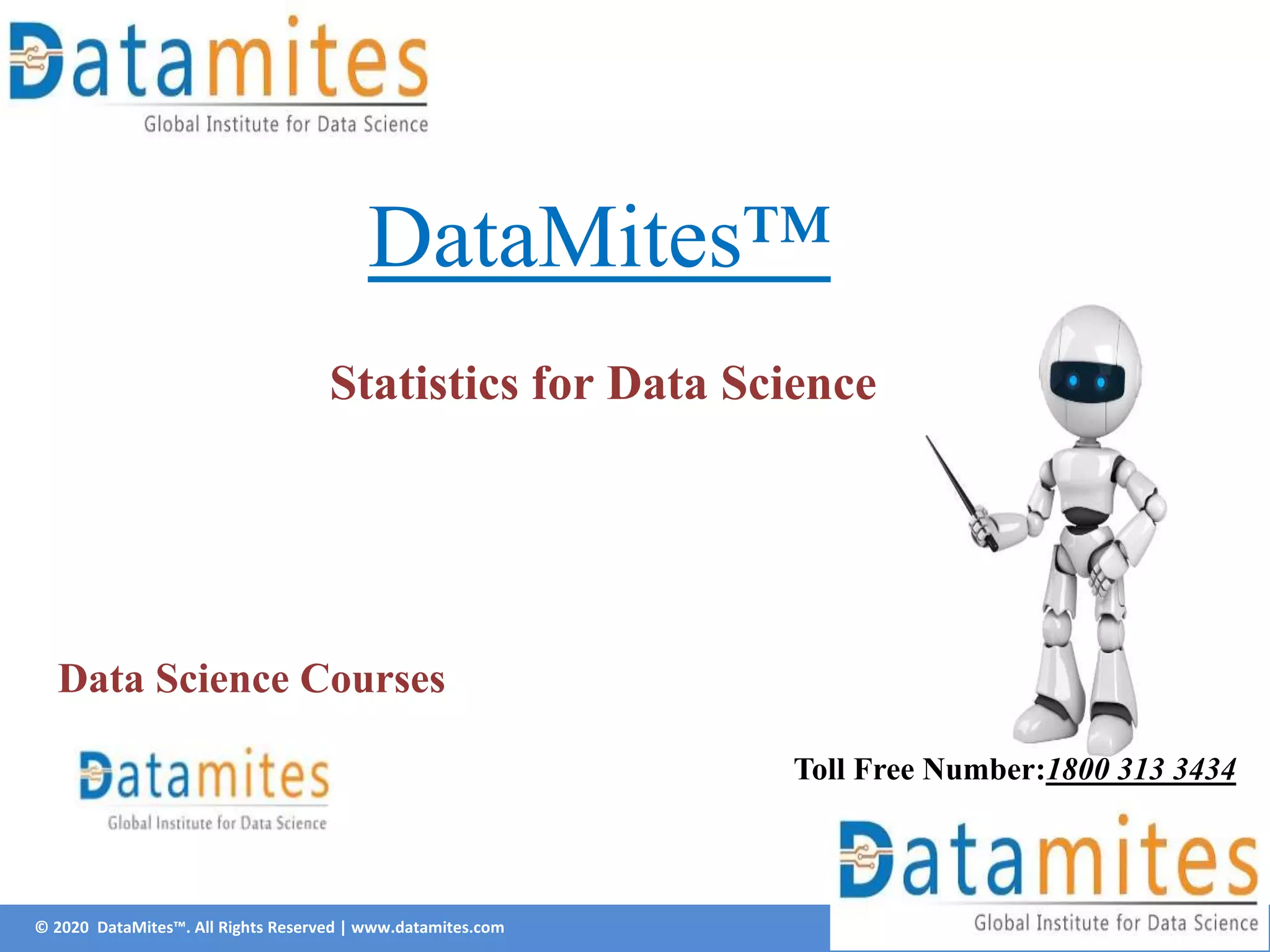 Statistics plays a key role in data science, providing meaningful insights through analysis of raw data and building statistical models. The document discusses the importance of statistics in data science, describing quantitative and qualitative statistical analysis methods. It also outlines three central measures of statistics: mean, median, and mode. The document is an overview of statistics for data science courses provided by Datamites.
