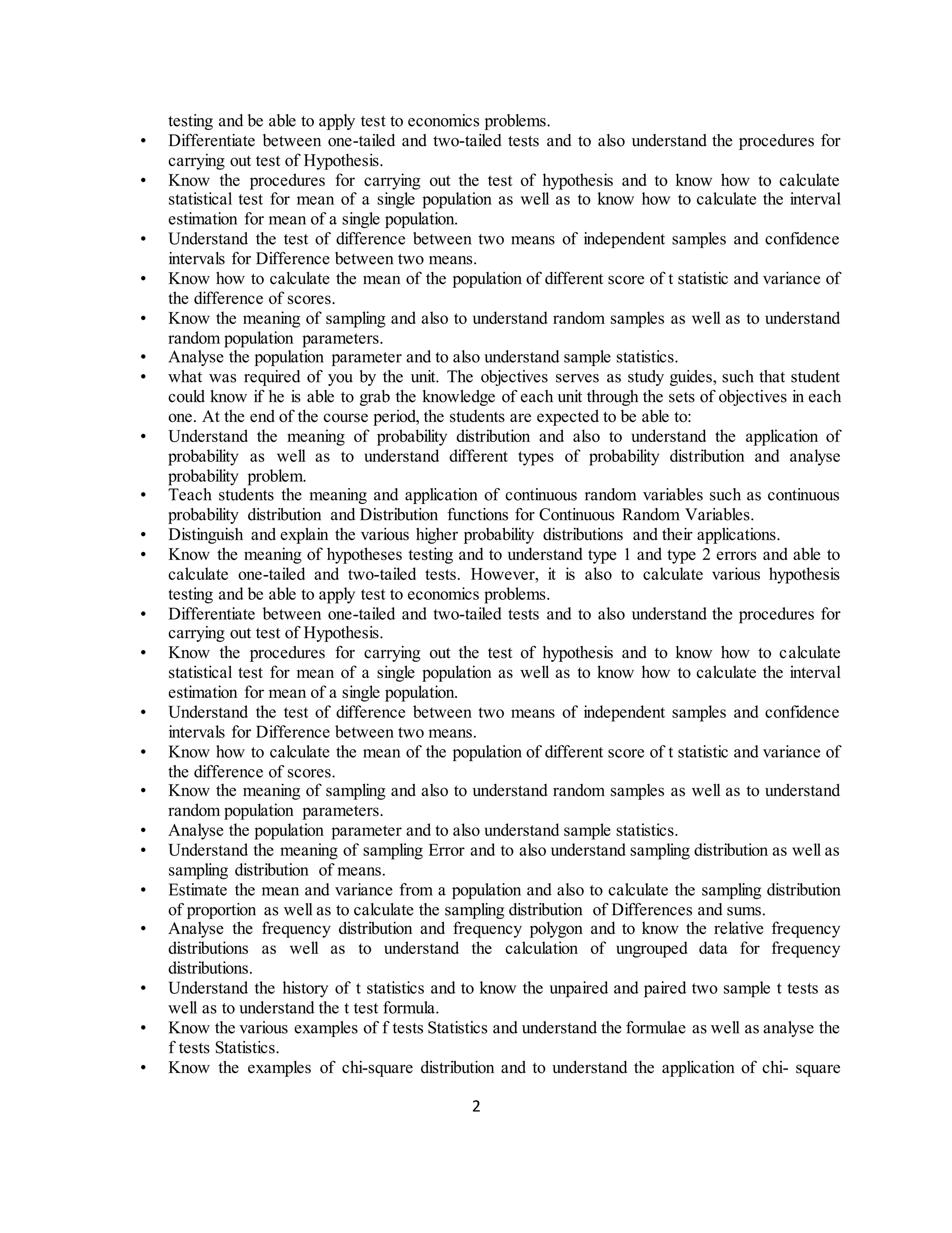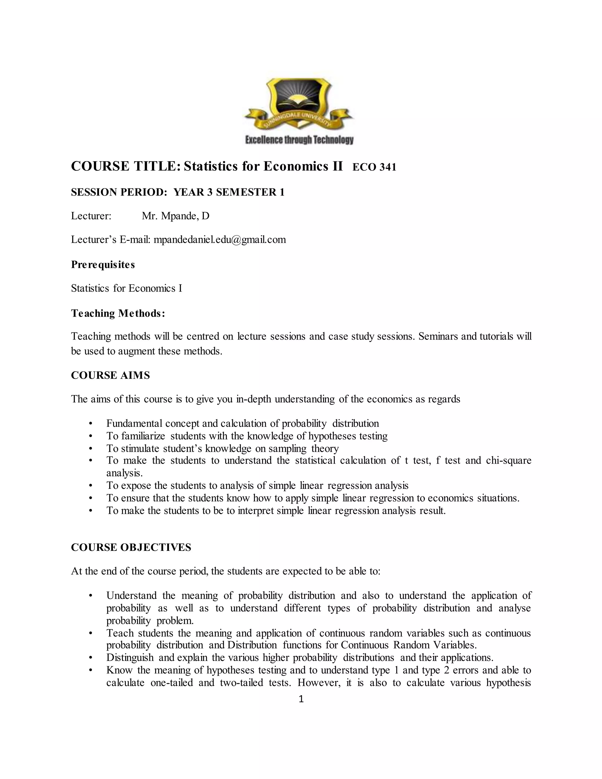 This document provides information on the Statistics for Economics II course. The course aims to give students an in-depth understanding of probability distributions, hypothesis testing, sampling theory, and simple linear regression analysis and its application to economics. The course will be taught through lectures, case studies, seminars and tutorials. Students will be assessed through continuous assessments, tests, presentations and a final exam which contributes 60% to the final grade. The course outline details 5 topics that will be covered across 13 units including probability distributions, hypotheses testing, sampling theory, t-tests, f-tests, and chi-square analysis and simple linear regression analysis.