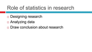 Descriptive statistics are used to summarize and describe characteristics of a data set. It includes measures of central tendency like mean, median, and mode, measures of variability like range and standard deviation, and the distribution of data through histograms. Inferential statistics are used to generalize results from a sample to the population it represents through estimation of population parameters and hypothesis testing. Correlation and regression analysis are used to study relationships between two or more variables.