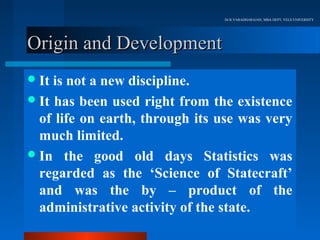 The document provides an introduction to statistics, covering its origin and development, definitions, types of statistics (descriptive and inferential), data collection methods, organization and presentation of data, and variables. It discusses how statistics has evolved from its early use by governments to keep records to its current role across various fields such as business, research, and the natural and social sciences. Key aspects of statistics like data collection, organization, analysis, and interpretation are also introduced.