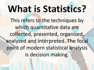 This document provides an introduction to statistics. It defines statistics as techniques used to collect, organize, analyze and interpret quantitative data. There are two main kinds of statistics: descriptive statistics, which summarizes and describes data through graphical or computational methods; and inferential statistics, which makes inferences about populations based on samples. Key statistical concepts introduced include populations, samples, data types (continuous and discrete), methods of data presentation (graphs), and measures of central tendency (mean, median, mode) and dispersion (range).