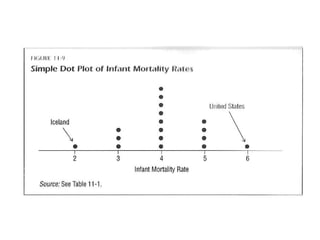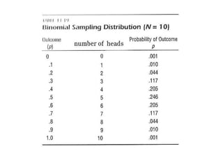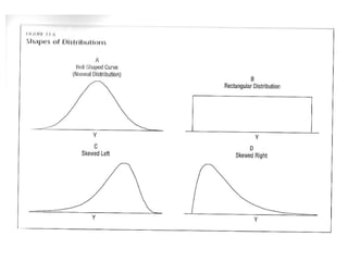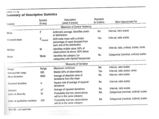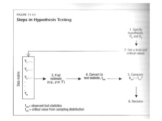 The document provides an overview of key statistical concepts including variance, standard deviation, the normal distribution, frequency distributions, data matrices, properties of good graphs, populations and samples, parameters and statistics, hypothesis testing, and point and interval estimation. It defines these terms and explains concepts like the null hypothesis, alternative hypothesis, critical regions, test statistics, and making decisions based on probability thresholds.