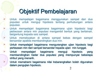 Dokumen ini membincangkan penggunaan statistik dalam pentaabiran berkaitan pengujian hipotesis untuk perbezaan antara dua populasi, dengan penjelasan mengenai petunjuk seperti saiz sampel dan varian. Ia menyertakan contoh pengiraan untuk ujian hipotesis dengan pelbagai situasi dan kaedah statistik untuk menguji perbezaan min serta menyediakan panduan untuk membuat keputusan berdasarkan nilai z dan t. Selain itu, ia juga membahas tentang selang keyakinan dalam konteks perbandingan purata perbelanjaan pelanggan.