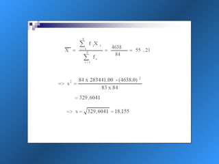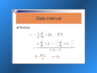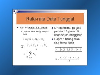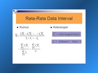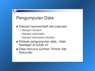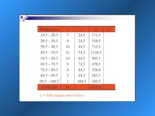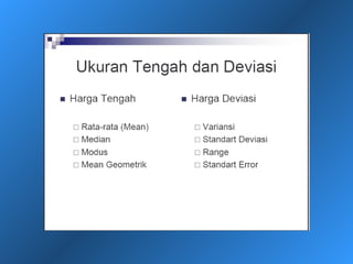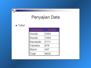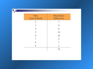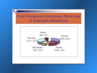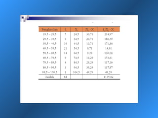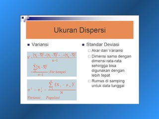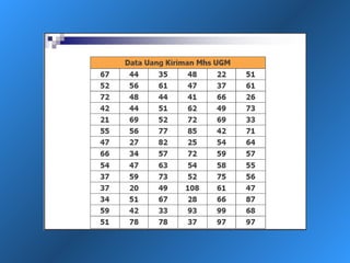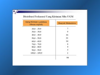 Dokumen ini menjelaskan statistik deskriptif, termasuk definisi data dan variabel, jenis-jenis data berdasarkan skala pengukuran, dan cara penyajian data melalui tabel dan grafik. Selain itu, diuraikan pula manfaat dan prosedur penggunaan tabel dan grafik untuk menganalisis dan merepresentasikan data kualitatif dan kuantitatif. Contoh-contoh yang diberikan mencakup berbagai representasi visual dan analisis data termasuk distribusi frekuensi, histogram, ogive, dan diagram scatter.