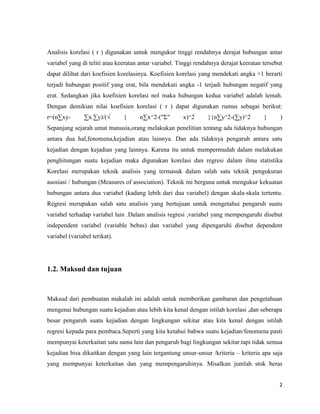 Dokumen ini membahas analisis regresi dan korelasi, dengan fokus pada hubungan antara jumlah stok beras dan harga beras di Banyumas. Melalui analisis regresi sederhana, diperoleh persamaan yang menunjukkan bahwa penurunan stok beras berhubungan dengan kenaikan harga, dengan koefisien korelasi yang sangat tinggi. Kesimpulannya, pengaruh jumlah stok beras terhadap harga sangat signifikan, dan ada rekomendasi untuk pengawasan dan peningkatan produksi beras.