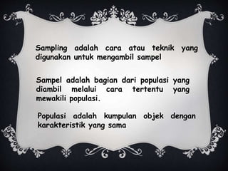 Dokumen ini membahas beberapa metode sampling yaitu sampling random, stratified, systematic, dan cluster. Sampling digunakan untuk mengambil sampel mewakili populasi dengan cara tertentu serta tujuan menghemat waktu dan biaya penelitian.
