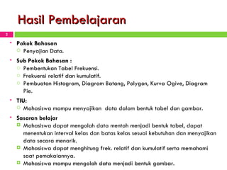 Dokumen tersebut membahas tentang statistika dan penyajian data. Secara singkat, dokumen tersebut menjelaskan bagaimana mahasiswa dapat mengolah data mentah menjadi tabel dan gambar seperti histogram, diagram batang, dan kurva ogive untuk menyajikan data secara sistematis dan menarik.