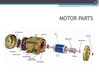 The document discusses the design of the stator in an electric motor. It covers key aspects of stator design including the stator lamination material and patterns, winding methods, insulation techniques, and manufacturing processes. Design considerations like reducing cogging torque, maintaining a small air gap, effective stator cooling, and robust stator construction are also addressed to optimize motor performance and reliability.