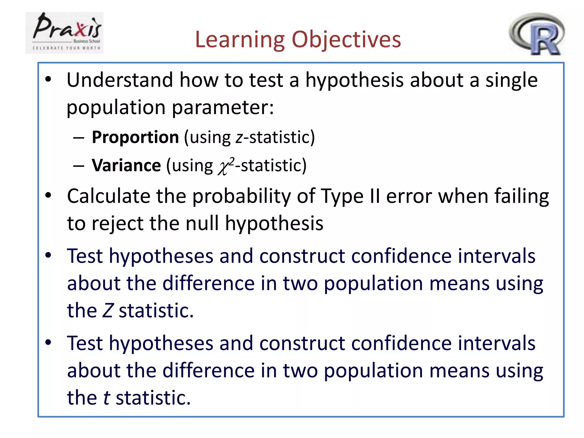 The document outlines learning objectives related to hypothesis testing and constructing confidence intervals for statistical analyses. Key objectives include: testing hypotheses about single and two population parameters using z-tests, t-tests, and chi-squared tests; calculating type II error rates; and constructing confidence intervals for differences between two population means and proportions. Examples are provided for hypothesis tests of a single population proportion, comparing variances, and differences between two population means.