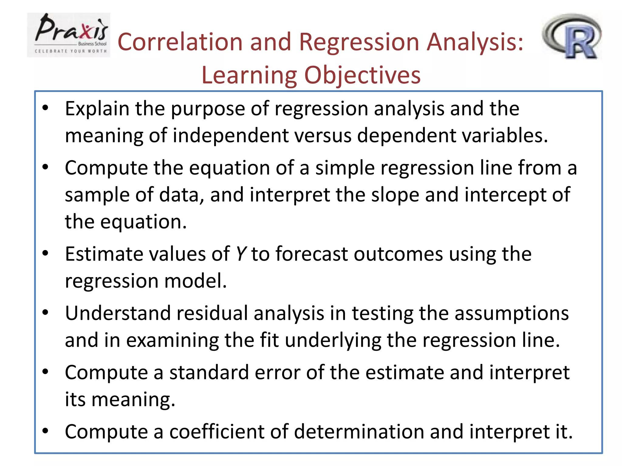 This document provides an overview of correlation and regression analysis concepts including: