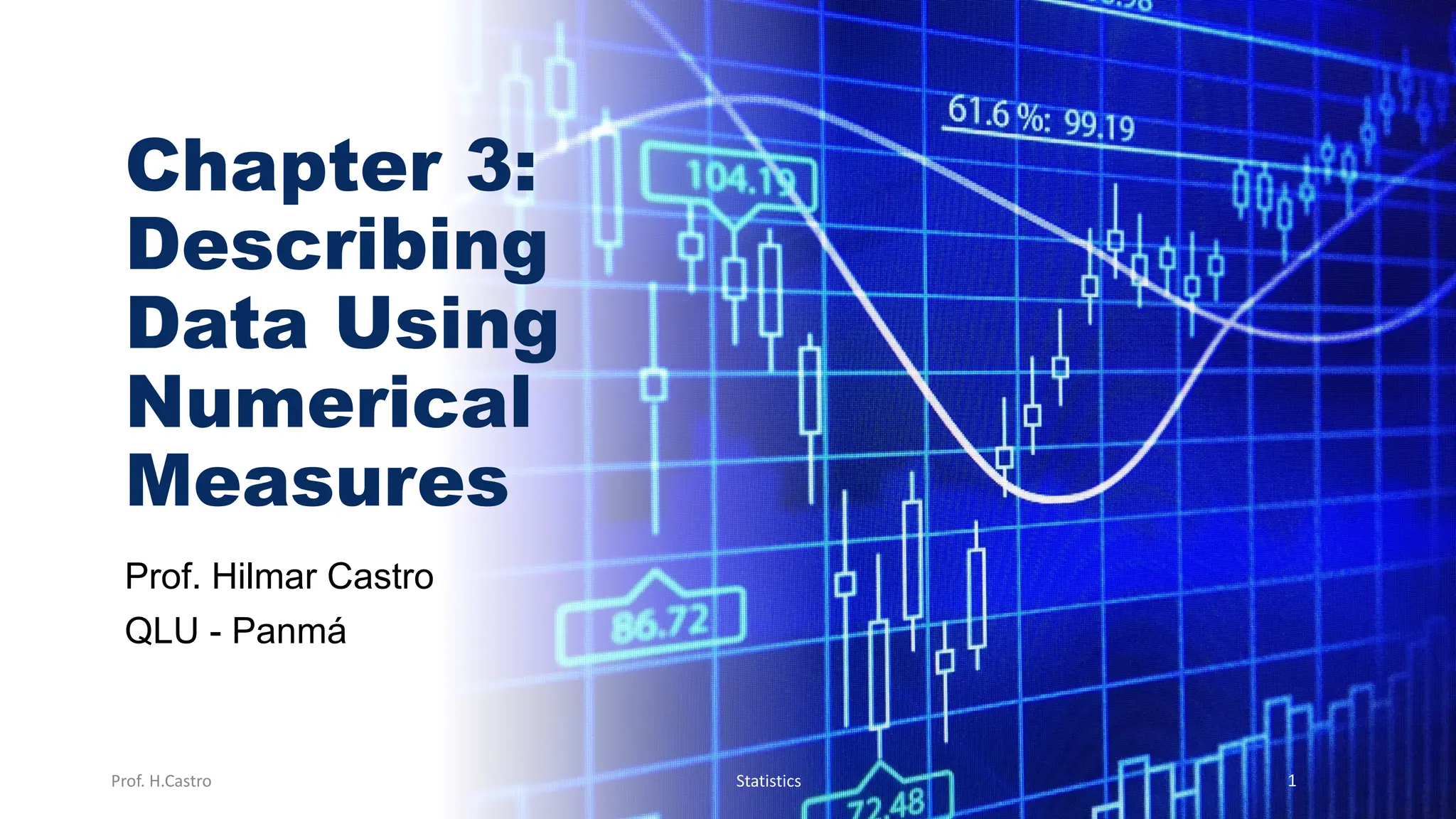 Chapter 3 focuses on numerical measures to describe data, including central tendency (mean, median, mode), variation (variance, standard deviation, range), and distribution shape. It explains how these measures differ between population parameters and sample statistics, as well as their significance in data analysis. The chapter also highlights the impact of outliers and the use of box-and-whisker plots and percentiles to visualize data distribution.