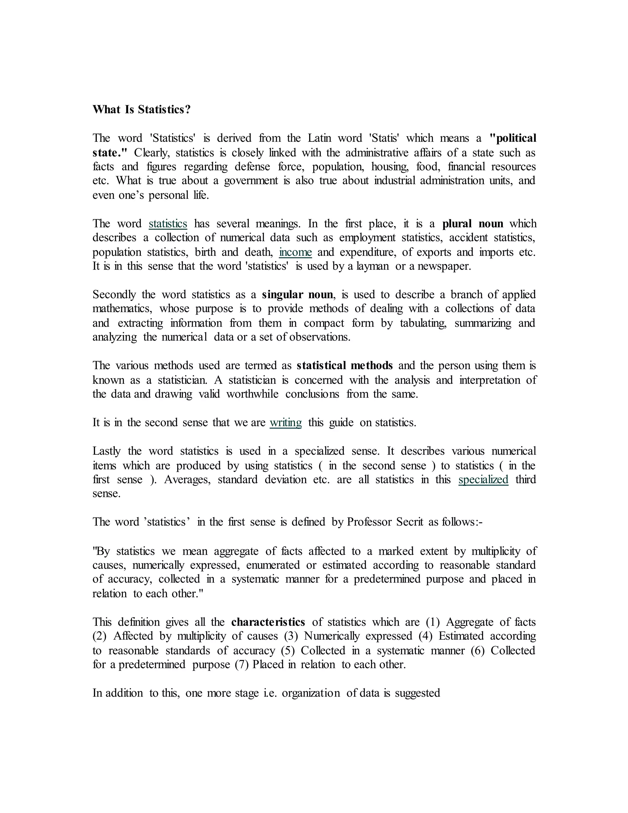 Statistics, derived from the Latin word 'statis,' relates to the collection and analysis of numerical data impacting various sectors like government and business. It encompasses different definitions, including a plural noun representing data collections and a singular noun denoting a branch of applied mathematics that analyzes these data. Statisticians are professionals who collect, organize, and interpret data to provide insights, while statistics is vital across diverse fields for informed decision-making and understanding complex problems.