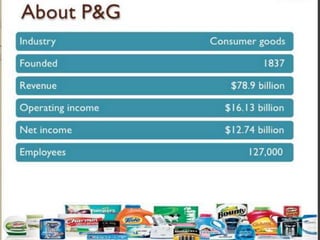The document lists the group members submitting a report to Dr. Meena Vazirani. It then provides details about Procter & Gamble (P&G), including that it is ranked 5th on a survey of most respected companies and is the largest consumer products company by sales. It discusses P&G's consumer-driven supply network initiative to better match supply to actual consumer demand. Finally, it concludes that P&G focuses on sustainable improvements in products, operations, social responsibility and through engagement with employees and stakeholders.